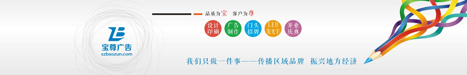 蘇州寶尊廣告有限公司是一家集廣告設計、廣告制作、廣告印刷、展示器材、標識字牌、禮儀慶典、代理發布服務于一體的綜合性廣告公司。注冊資金100萬元,可為工廠公司、商場旅業、媒體策劃等眾多企業提供多方面的廣告服務。我們具有一支從事廣告行業多年,設計制作施工團隊人員,憑著“品質為寶、客戶為尊”的經營理念,用技術和服務,讓客戶用的成本獲得利益,贏得了廣大客戶的信任和支持...... [閱讀詳情]